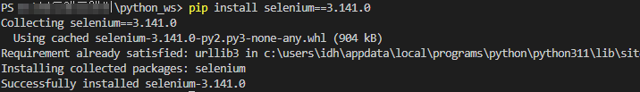 셀레니움 설치는 해당 블로그를 통해 참고해서 설치를 진행하면 됩니다. 저는 VSC를 통해서 진행하고 있고 파이참으로 하셔도 됩니다. 추가로 가장 중요한 건 크롬 웹드라이버가 현재 해당 파이썬 폴더 내부에 존재해야 합니다.