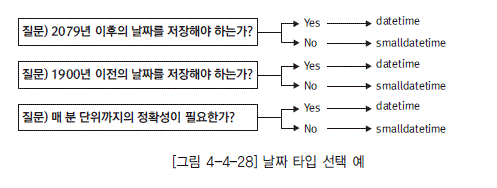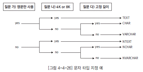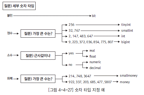 여기에서의 DBMS별 특성은 이 책을 통해 설명하는 것은 불가능하다. 따라서 여기에서는 대표적인 데이터 타입의 선택 기준에 대해서만 언급한다. 여기에서 는 데이터 타입의 선택에 대한 예제를 들어 설명한다.