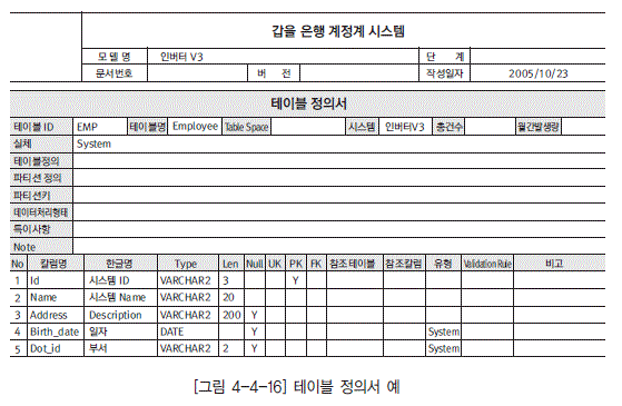 기본적인 테이블 변환, 칼럼 변환 작업이 완성되면 테이블 정의서를 생성할 수 있다. 대부분의 시스템 구축 프로세스상에서 개발자들이 프로그램 개발을 수행하는 단계에서 가장 많이 참조하는 산출물 중 하나이다.