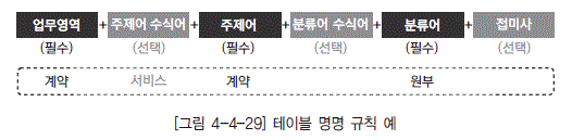 - 테이블의 명명 순서는 업무 영역 + 주제어 수식어 + 주제어 + 분류어 수식어 + 분류어 + 접미사 순으로 한다.