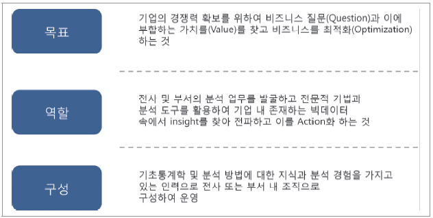 데이터 분석 조직은 기업의 경쟁력을 확보하기 위해 데이터 분석의 가치를 발견하고, 이를 활용해 비즈니스를 최적화하는 목표를 갖고 구성돼야 한다. 이를 위해 기업이 업무 전반에 걸쳐 다양한 분석 과제를 발굴·정의하고, 데이터 분석을 통해 의미 있는 인사이트를 찾아 실행하는 역할을 수행할 수 있어야 한다.